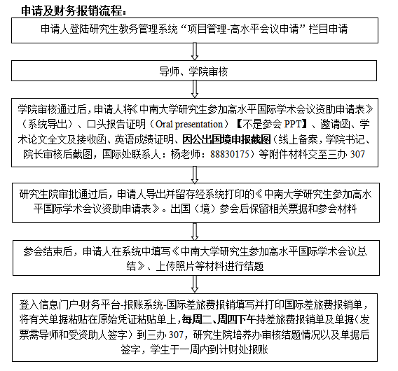 申请条件和资助标准按《中南大学资助研究生参加高水平国际学术会议管理办法(中大研字〔2016〕98号)》执行,因公出国(境)手续备案流程请参照中南大学校内通知网站https://oa.csu.edu.cn/con/PDFPage?YWMC=ZNDX_ZHBG_GGTZ&JLNM=2D09F32335BB4B84A4840F652E45F879。境外直接参会备案请直接联系国际处:88830175。